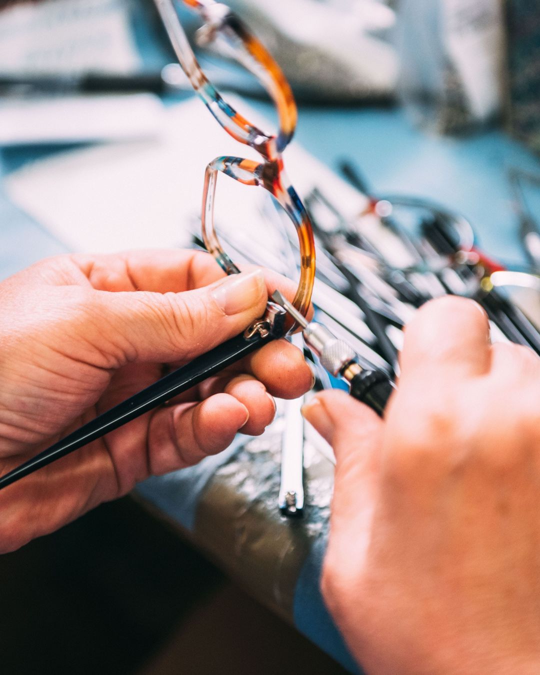 Definiamo le linee della montatura e levighiamo manualmente ogni superficie. Comfort su naso e aste, finitura uniforme, vestibilità Made in Italy.