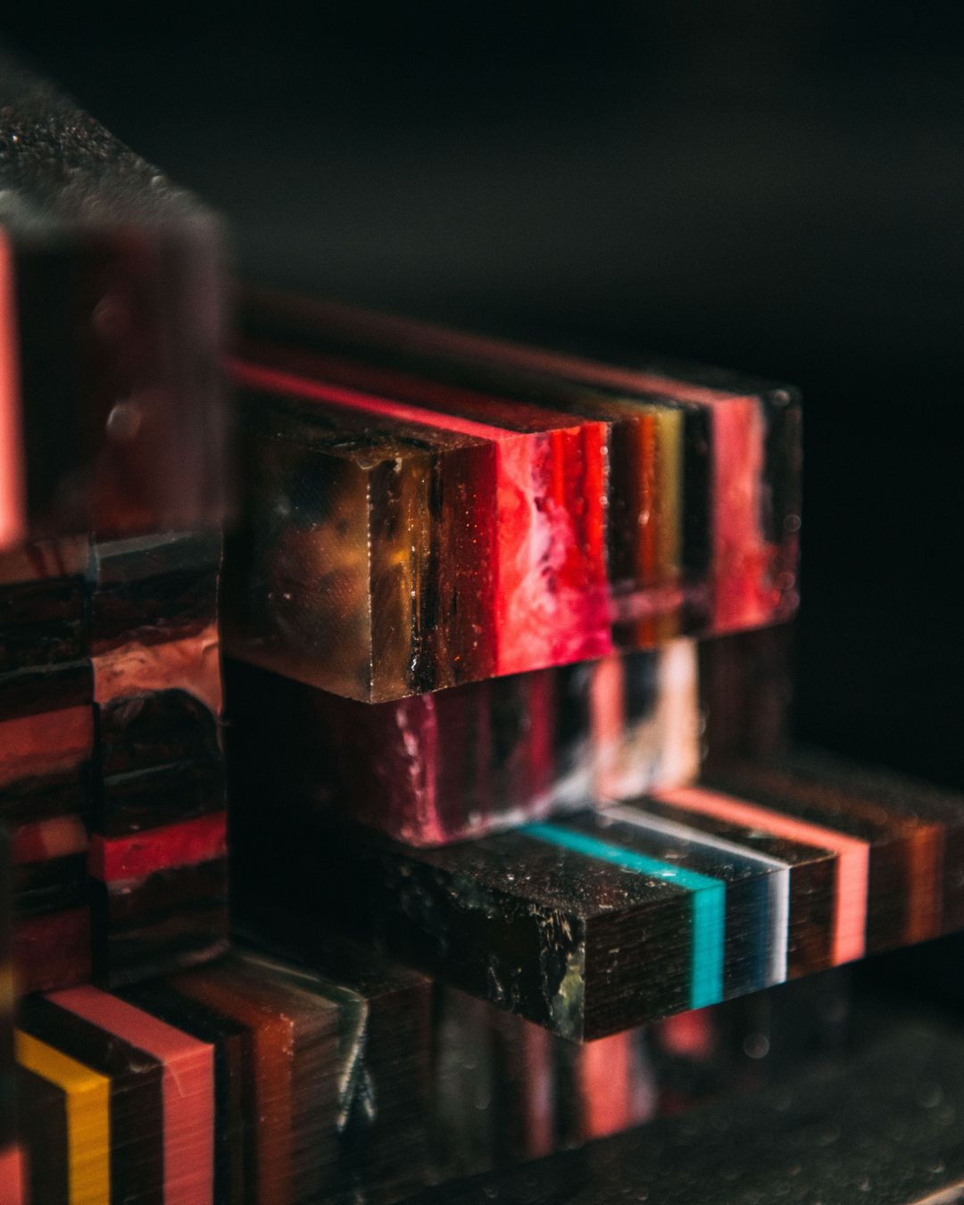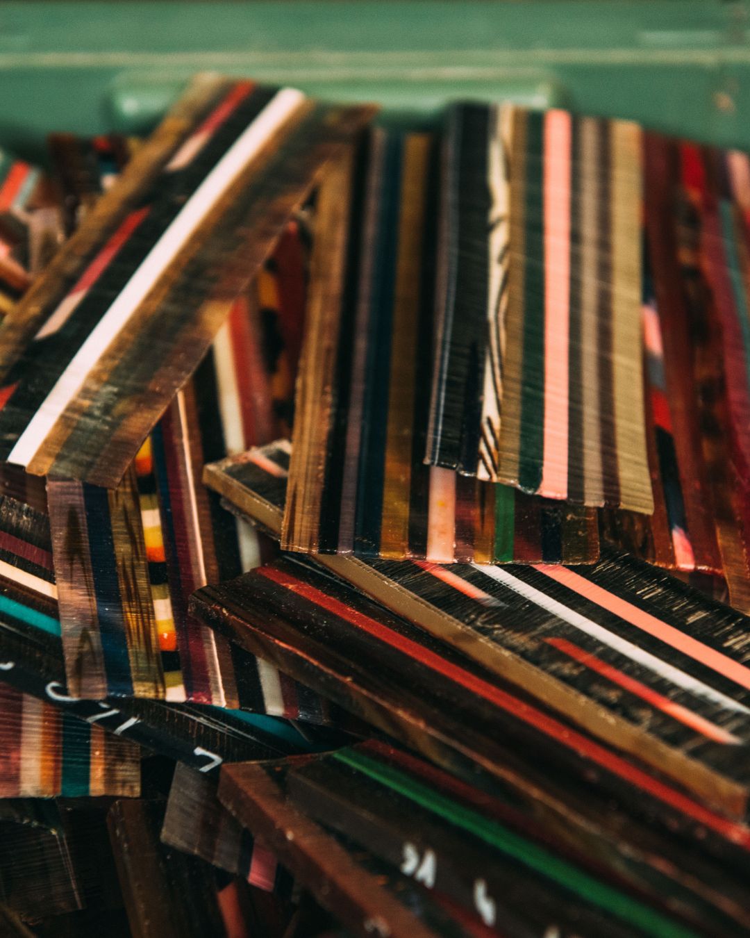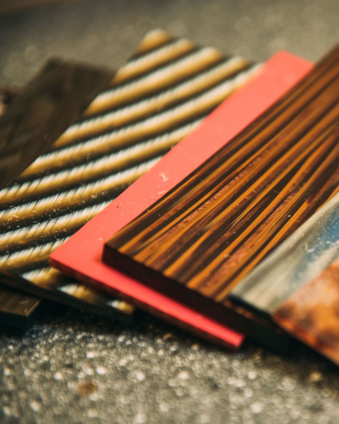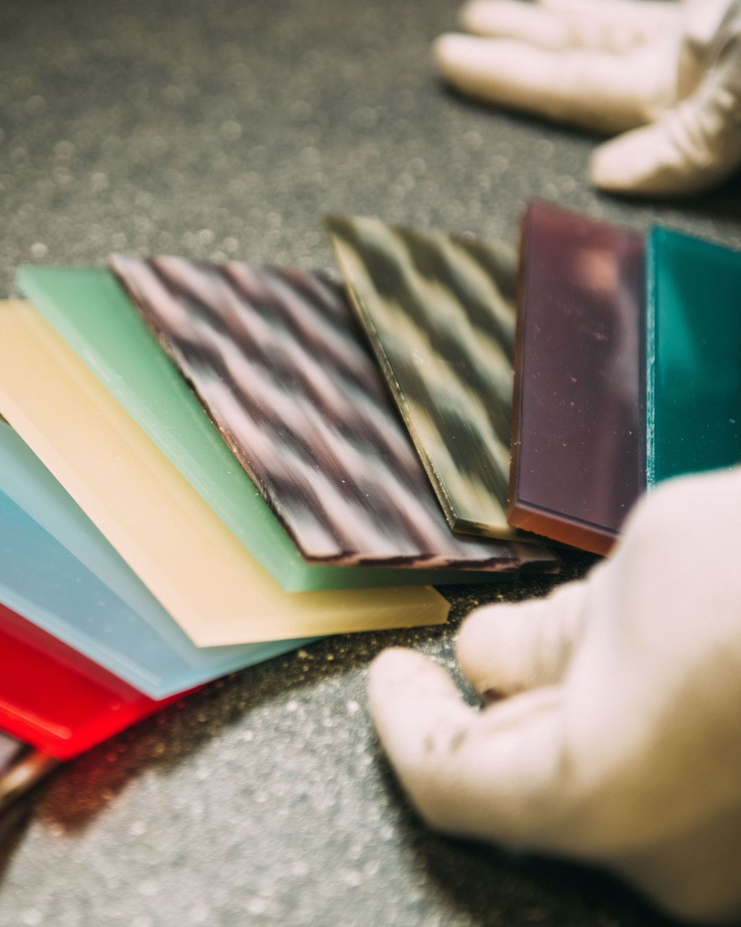 I nostri artigiani , maestri del distretto bellunese, selezionano 8–12 lastre di acetato e ne studiano luce, contrasto ed equilibrio. Ogni accostamento è pensato per generare pattern irripetibili.